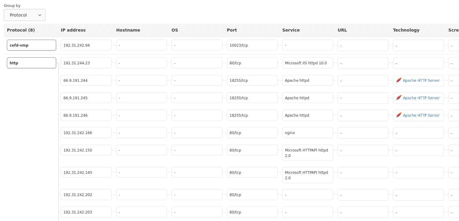 Looking at the mapped Attack Surface, sorted by IPs, reveals that these Apache web servers are running on the non-standard HTTP port 18255.